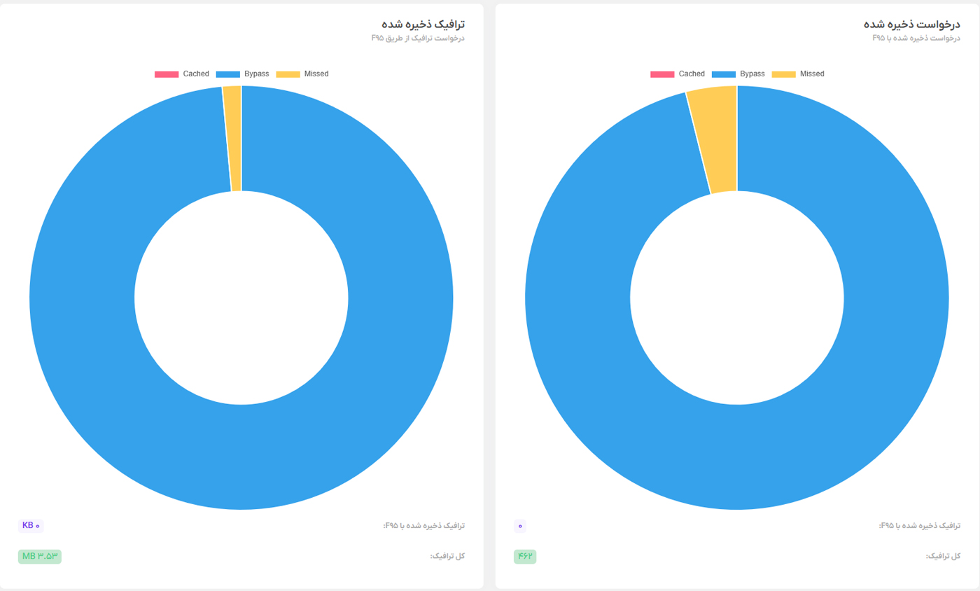 در پایین نمودار خطی، دو نمودار دایره‌ای قرار گرفته‌اند که وضعیت ذخیره‌سازی را بهتر نشان می‌دهند. در نمودار سمت راست، تعداد کل درخواست‌هایی که کاربران به سایت ارسال کرده‌اند تفکیک می‌شود. بخش آبی نشان‌دهنده درخواست‌هایی است که از کش تحویل داده شده‌اند، بخش زرد نشان‌دهنده درخواست‌هایی است که در کش موجود نبوده‌اند و مستقیم از سرور اصلی دریافت شده‌اند و بخش صورتی نشان‌دهنده درخواست‌هایی است که عمداً کش را دور زده‌اند. در نمودار سمت چپ، همین تفکیک برای حجم ترافیک نشان داده می‌شود، یعنی مشخص می‌کند چه مقدار از پهنای باند توسط کش تأمین شده و چه مقدار مستقیماً از سرور مصرف شده است.