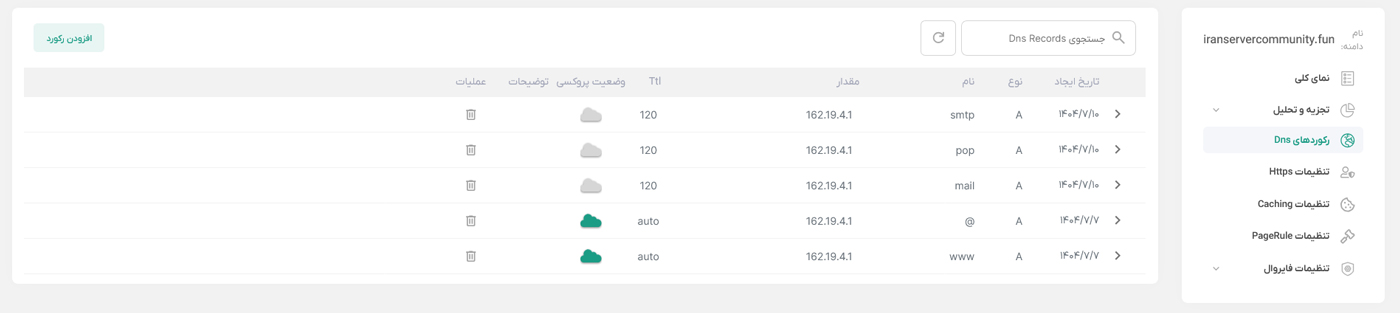 ابتدا وارد پنل کاربری CDN شوید و روی بخش رکوردهای DNS کلیک کنید. در این بخش تمام رکوردهای دامنه شما نمایش داده میشوند. هر رکورد شامل اطلاعاتی مثل نوع رکورد (Type)، نام رکورد (Name)، مقدار یا Value، وضعیت پروکسی، TTL و تاریخ ایجاد است. این صفحه اصلی محلی است که شما مدیریت کامل رکوردهای دامنه خود را در آن انجام میدهید.