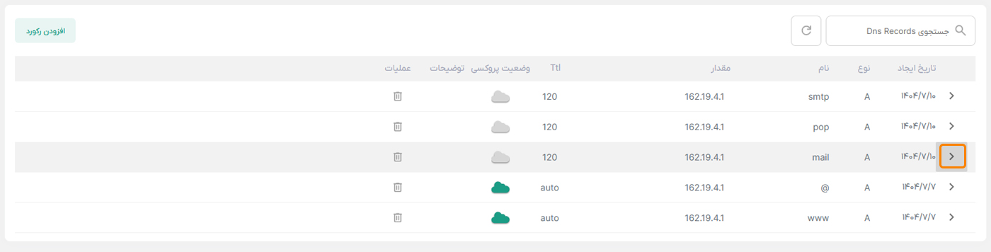 برای حذف رکورد، در مقابل آن یک آیکون سطل زباله وجود دارد. با کلیک روی آن و تأیید نهایی، رکورد موردنظر حذف خواهد شد. دقت کنید که حذف رکوردهای اصلی مثل A یا MX ممکن است باعث قطع دسترسی سایت یا ایمیل شود، بنابراین قبل از حذف مطمئن شوید به آن نیازی ندارید یا رکورد جایگزین تعریف کردهاید.