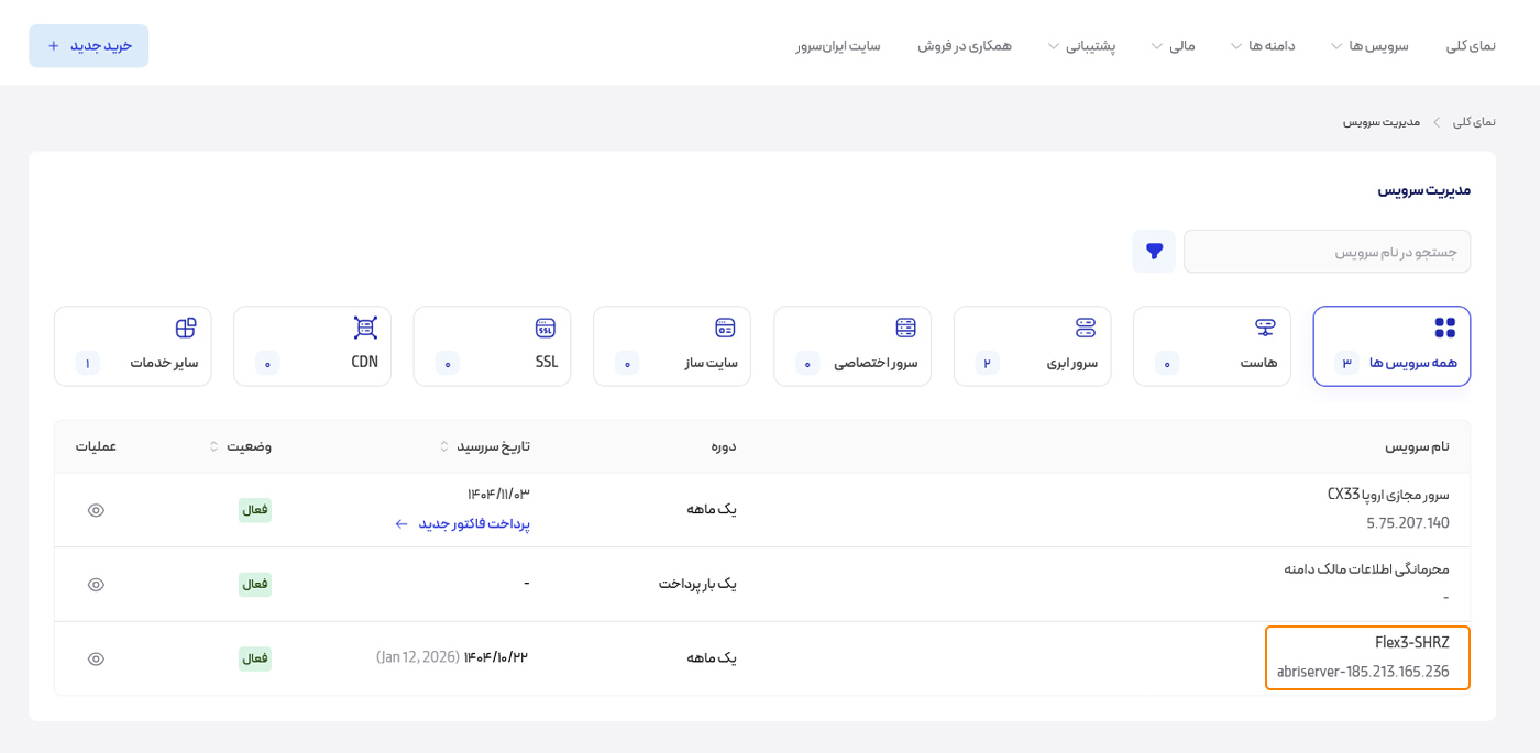 بعد از ورود به پنل کاربری، لیستی از سرویسهایی که روی حساب شما فعال هستند نمایش داده میشود. در این بخش باید سرویس ابریای را که قصد تغییر سیستم عامل آن را دارید پیدا کنید. با کلیک روی نام سرویس ابری، وارد صفحه مدیریت همان سرویس میشوید. در این صفحه اطلاعات کلی مثل وضعیت روشن یا خاموش بودن سرویس، منابع اختصاص داده شده و دسترسیهای مهم نمایش داده میشود. این بخش مرکز اصلی مدیریت سرویس ابری است و تمام عملیات مدیریتی مانند خاموش کردن، راهاندازی مجدد و تغییر سیستم عامل از همین قسمت انجام میشود.