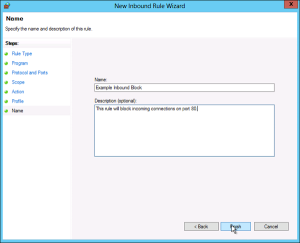 - یک نام برای قانون فایروال خود وارد کنید و (در صورت نیاز) یک توضیح اختیاری اضافه کنید. سپس روی Finish کلیک کنید.