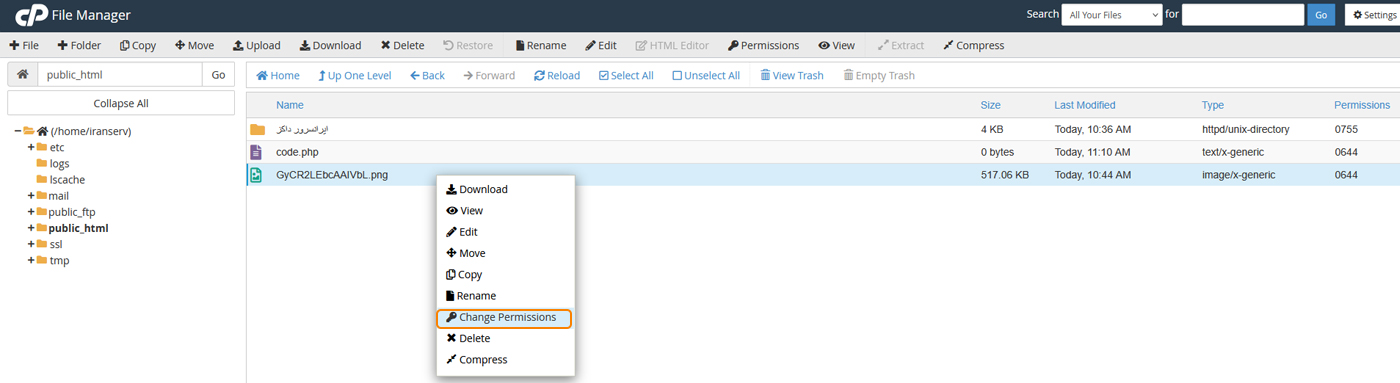 برای تغییر سطح دسترسی یک فایل یا پوشه کافی است روی آن راست‌کلیک کرده و گزینه Change Permissions را انتخاب کنید.