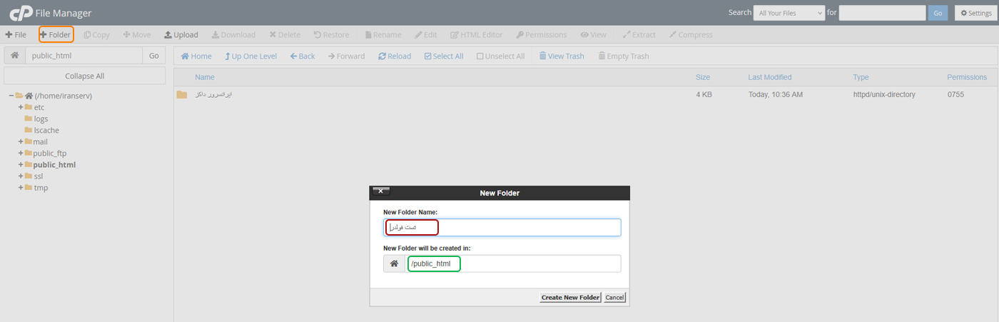 اگر بخواهید پوشه جدید بسازید باید روی دکمه Folder+ کلیک کنید. در این مرحله باید نام پوشه را وارد کرده و محل ذخیره آن را مشخص کنید و در پایان روی Create New Folder کلیک کنید. اگر می‌خواهید فولدر در صفحه اصلی شما ایجاد شود باید آن را در مسیر “public_html” ایجاد کنید.