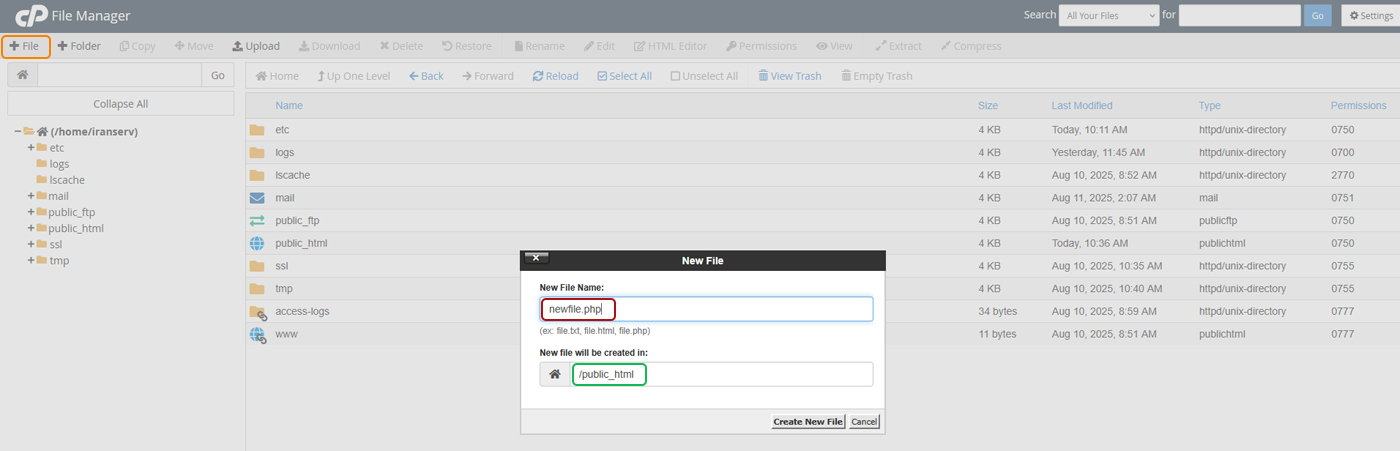 برای ساخت فایل جدید، در بالای صفحه روی دکمه File+ کلیک کنید. نام فایل را وارد کنید و مکان ذخیره‌سازی (پوشه مقصد) را انتخاب کنید و سپس Create New File را بزنید. اگر می‌خواهید فایل در صفحه اصلی شما ایجاد شود باید آن را در مسیر “public_html” ایجاد کنید.