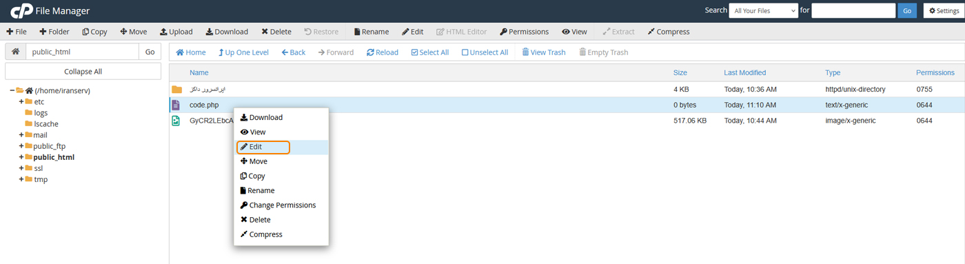 ویرایش فایل در ویرایشگر سی‌پنل
