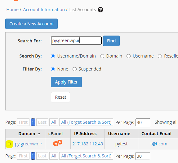 2-سپس در کادرجستجو اسم دامنه مدنظر را با کلیک بر روی گزینه find جستجو و بر روی علامت + در کنار نام دامنه کلیک نمایید.