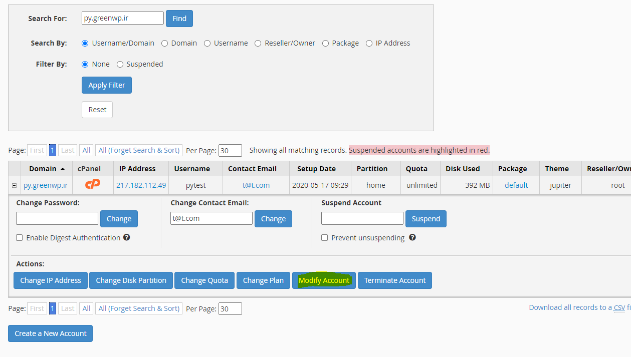 1-ابتدا وارد کنترل پنل از سطح whm شده و سپس در کادر جست و جوی سمت چپ کلمهList Accounts را وارد نمایید: