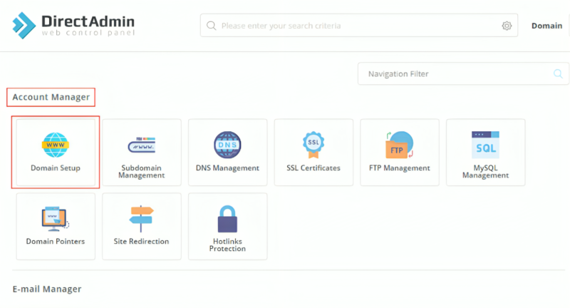1-ابتدا وارد کنترل پنل شده و از بخش account manager روی گزینه Domain Setup کلیک کنید