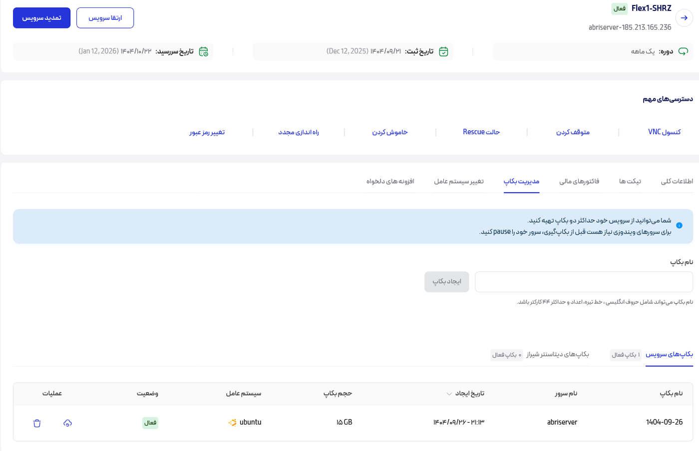 برای شروع بازگردانی وارد پنل کاربری ایرانسرور شوید و سرویس ابری موردنظر خود را باز کنید. در پایین صفحه بخش «بکاپ های سرویس» را مشاهده میکنید. در این قسمت تمام اسنپشاتهایی که قبلا از سرویس گرفتهاید بهصورت یک لیست نمایش داده میشود. در جدول اطلاعاتی مانند نام اسنپشات، تاریخ ایجاد، حجم بکاپ و سیستم عامل ثبت شده است تا بتوانید راحتتر اسنپشات مناسب را انتخاب کنید.