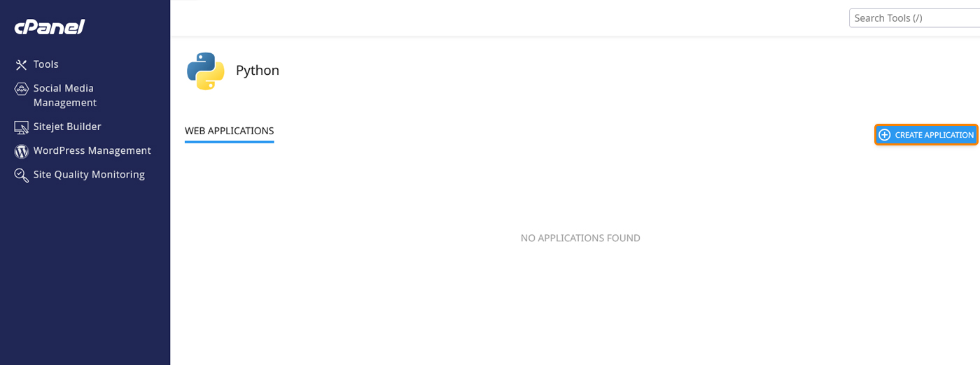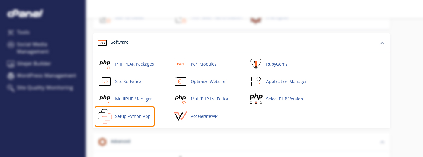 پس از ورود به پنل هاست پایتون، در بخش Software گزینهای به نام Setup Python App مشاهده میکنید. این بخش مخصوص ایجاد و مدیریت اپلیکیشنهای پایتون است. با کلیک روی آن وارد صفحه مدیریت اپلیکیشنها میشوید.