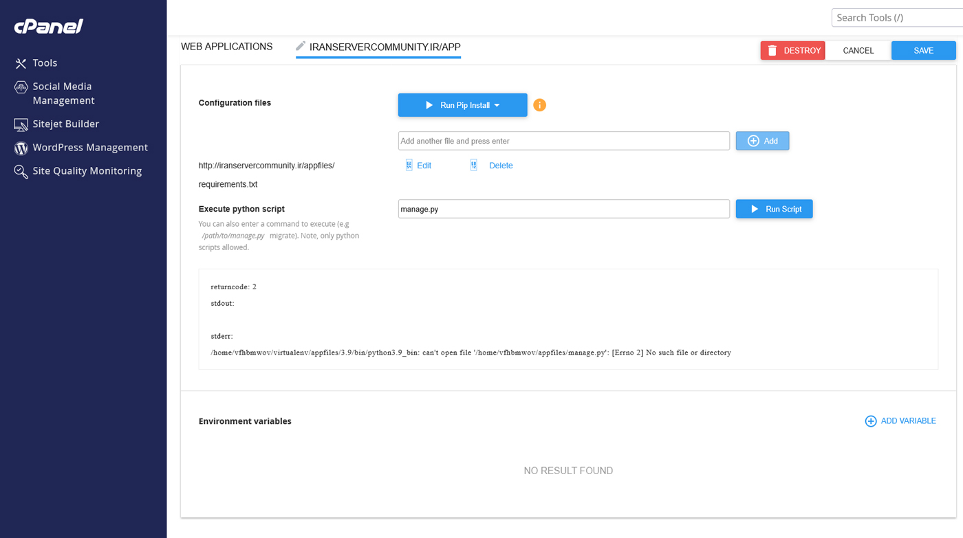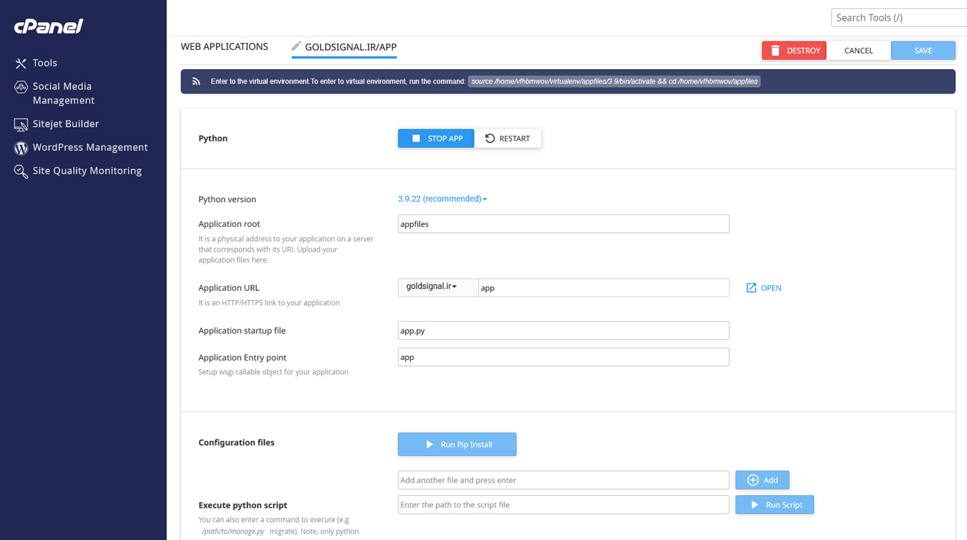 بعد از اینکه اپلیکیشن شما ساخته شد وارد صفحه مدیریت آن میشوید. در این صفحه میتوانید جزئیات تنظیمات پروژه خود را مشاهده کنید و تغییر دهید. در بالای صفحه نسخه پایتون انتخابشده، مسیر اپلیکیشن (Application Root)، دامنه متصلشده و فایل شروع پروژه نمایش داده میشود. همچنین دو دکمه مهم Stop App و Restart وجود دارد که برای متوقف کردن یا راهاندازی مجدد اپلیکیشن استفاده میشوند.