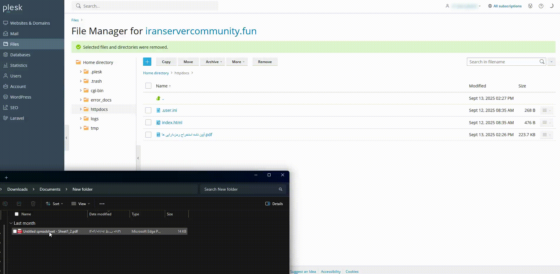 پس از انتخاب، فرایند بارگذاری شروع میشود و پس از تکمیل، فایل در همان پوشه نمایش داده خواهد شد. اگر چند فایل دارید، میتوانید آنها را به صورت یکییکی آپلود کنید یا قبل از بارگذاری، آنها را فشردهسازی کنید و بعداً از طریق پلسک استخراج نمایید.