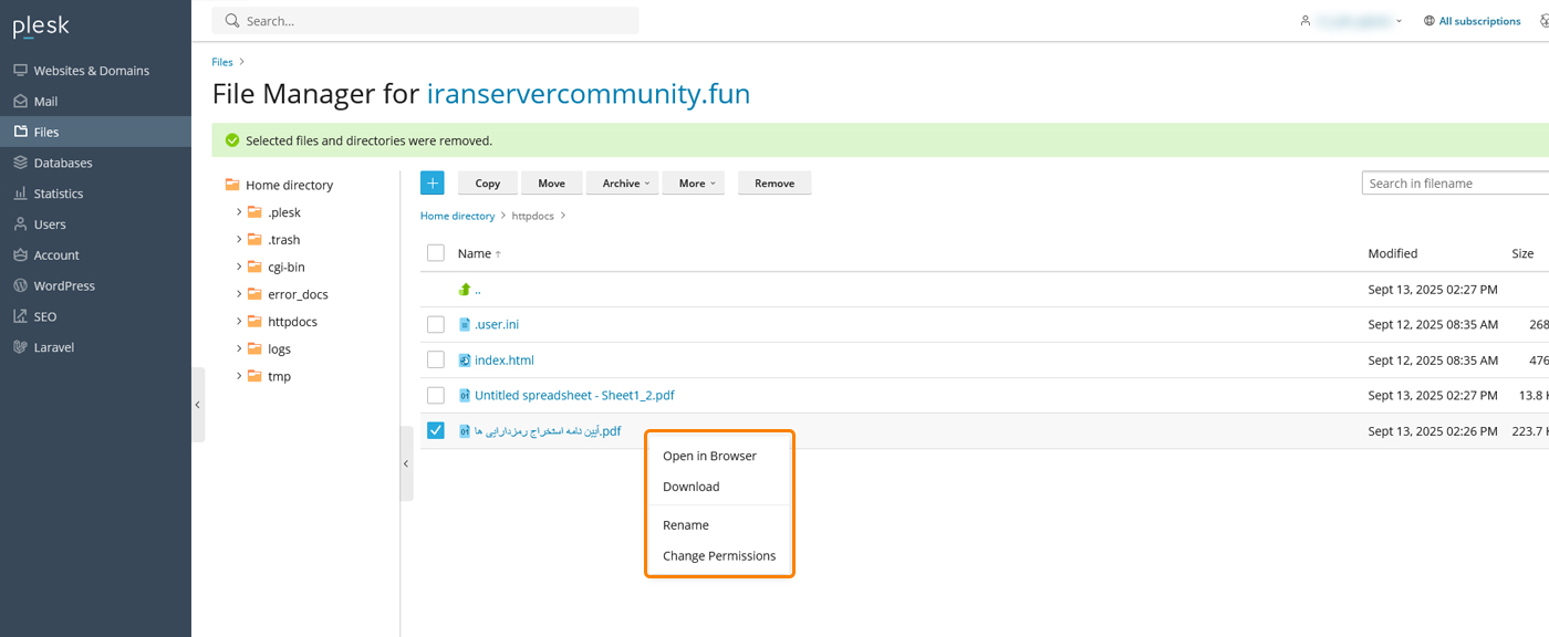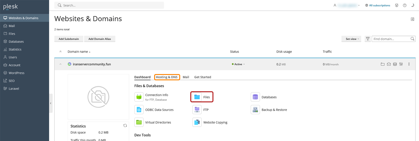 بعد از ورود به داشبورد پلسک، از ستون سمت چپ روی گزینه Websites & Domains کلیک کنید. در این بخش، لیست دامنههای فعال روی هاست شما نمایش داده میشود. در مقابل دامنهای که قصد دارید روی فایلهای آن کار کنید، از بخش Files & Databases گزینه Files وجود دارد. روی این گزینه کلیک کنید تا وارد محیط مدیریت فایلها شوید. این بخش دقیقاً مانند یک مرورگر فایل در ویندوز یا مک عمل میکند و امکان مدیریت مستقیم پوشهها و فایلهای سایت را فراهم میکند.