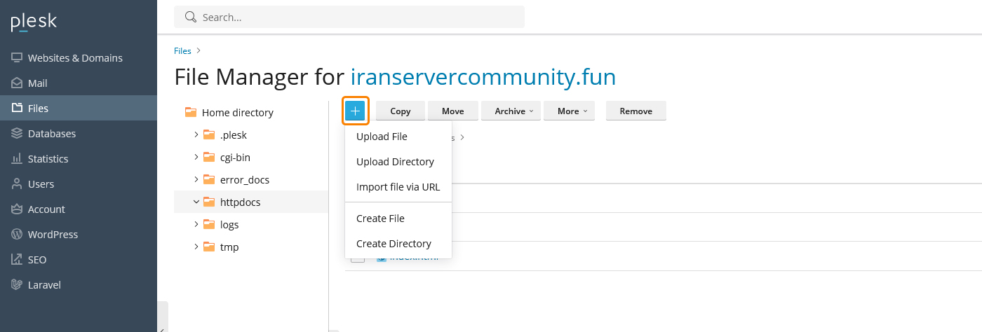 برای اضافه کردن فایل به هاست، باید وارد مسیر مناسب شوید. معمولاً فایلهای اصلی سایت در پوشه httpdocs قرار دارند. روی این پوشه کلیک کنید تا وارد آن شوید. سپس از منوی بالای File Manager دکمه Upload را انتخاب کنید. پنجره انتخاب فایل باز میشود و میتوانید فایل موردنظر خود (مثلاً یک تصویر، فایل HTML یا یک پلاگین وردپرس) را از سیستم شخصی انتخاب کنید.