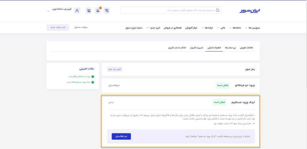 قابلیت لینک ورود مستقیم یکی دیگر از سیاستهای امنیتی ایرانسرور است. با فعالسازی این لینک، میتوانید بدون وارد کردن نام کاربری و رمز عبور از طریق لینکی که در ایمیلها و پیامکهای اطلاعرسانی مربوط به تیکت و فاکتور ارسال میشود، به صفحه مورد نظر دسترسی داشته باشید. برای آشنایی بیشتر با فرایند لینک ورود مستقیم این مقاله را مطالعه کنید.