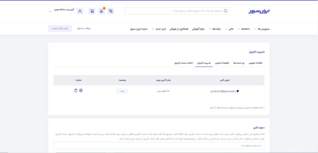 یکی دیگر از بخشهای مهم حساب کاربری، بخش مدیریت کاربران است. همانطور که میدانید با استفاده از این قابلیت شما میتوانید دسترسی حساب کاربری خودتان در ایرانسرور را به شخص دیگری منتقل کنید. البته نوع دسترسی را خود شما به عنوان مالک حساب انتخاب میکنید. توجه داشته باشید که با این کار مسئولیت حفظ اطلاعات بر عهده خود شما است. پس حتما در انتقال دسترسی به افراد مختلف دقت کافی داشته باشید. برای آشنایی با فرایند کامل میتوانید این مقاله را مطالعه کنید.