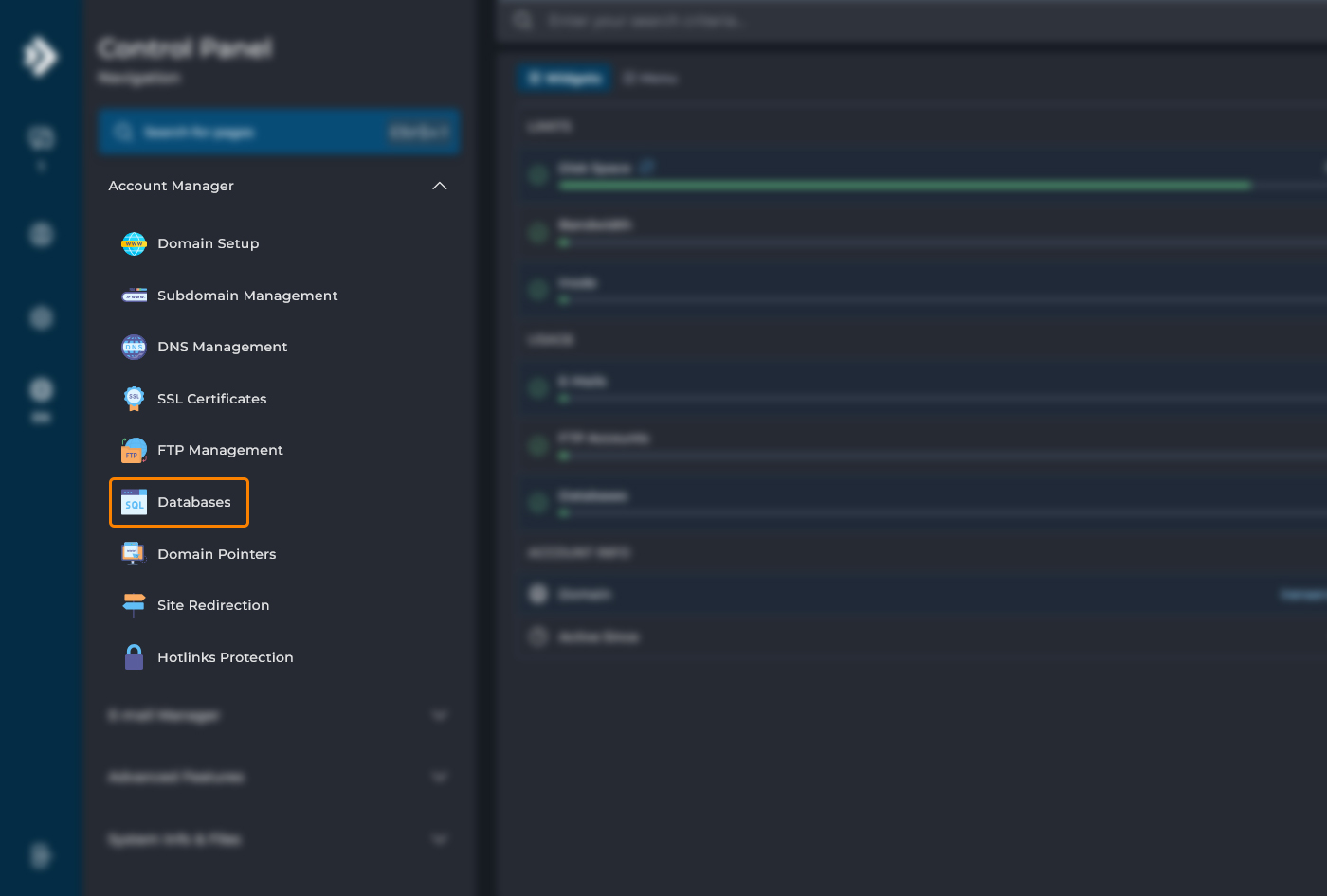 پس از ورود به پنل دایرکت ادمین، برای مدیریت پایگاه داده‌ها باید وارد بخش مربوط به دیتابیس شوید. در صفحه اصلی دایرکت ادمین، گزینه‌ای با عنوان Databases یا همان “دیتابیس‌ها” وجود دارد. با ورود به این بخش، لیست تمامی دیتابیس‌هایی که تا کنون ساخته‌اید نمایش داده می‌شود. در اینجا می‌توانید دیتابیس جدید ایجاد کنید، کاربران دیتابیس را مدیریت نمایید و همچنین وارد phpMyAdmin شوید.