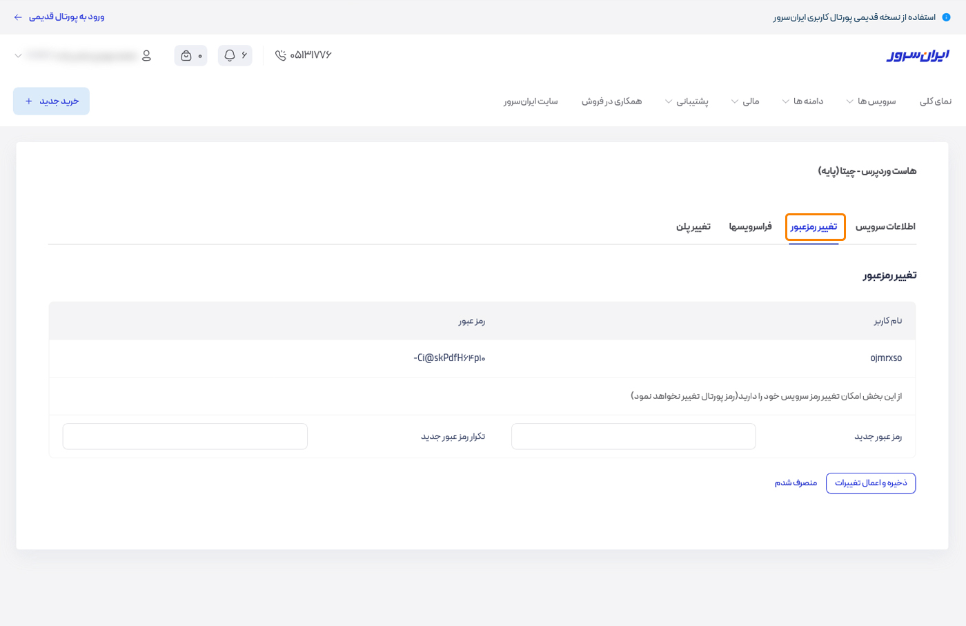 تغییر رمز از طریق پنل کاربری ایران‌سرور