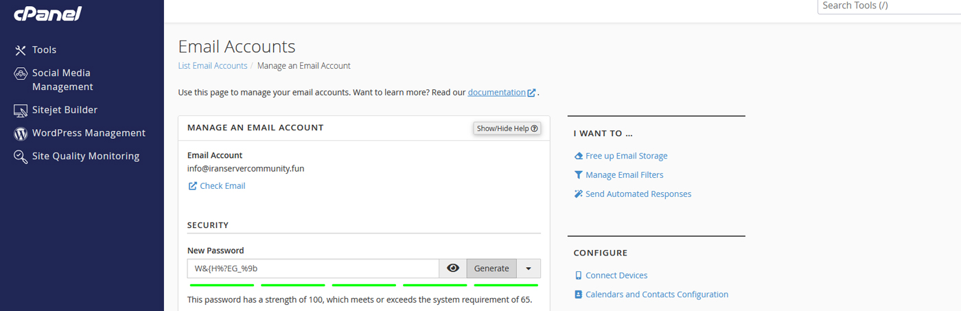 در صفحه مدیریت ایمیل، بخشی به نام Manage An Email Account وجود دارد که در آن فیلدی به نام New Password دیده میشود. اینجا میتوانید رمز عبور جدیدی برای ایمیل انتخاب کنید. بهتر است رمزی انتخاب کنید که شامل ترکیبی از حروف بزرگ، حروف کوچک، اعداد و نشانهها (مثل !، @، #) باشد تا امنیت ایمیل شما بیشتر شود. همچنین میتوانید از دکمه Generate استفاده کنید تا یک رمز قوی بهصورت خودکار برای شما ساخته شود. پس از تعیین رمز، برای ذخیره تغییرات روی دکمه Update Email Settings کلیک کنید.