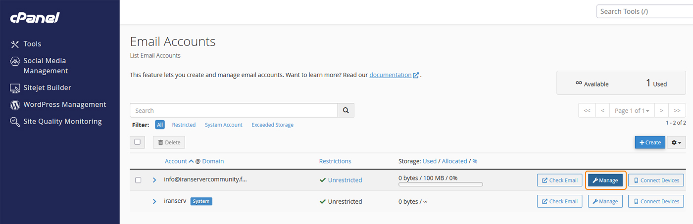 در لیست ایمیلها، همه حسابهایی که قبلاً ساختهاید نمایش داده میشوند. روبهروی هر ایمیل گزینههایی مثل Check Mail، Manage و Connect Devices وجود دارد. برای تغییر رمز یا ظرفیت باید روی دکمه Manage کلیک کنید. این گزینه شما را به صفحه مدیریت تنظیمات ایمیل انتخابی هدایت میکند.