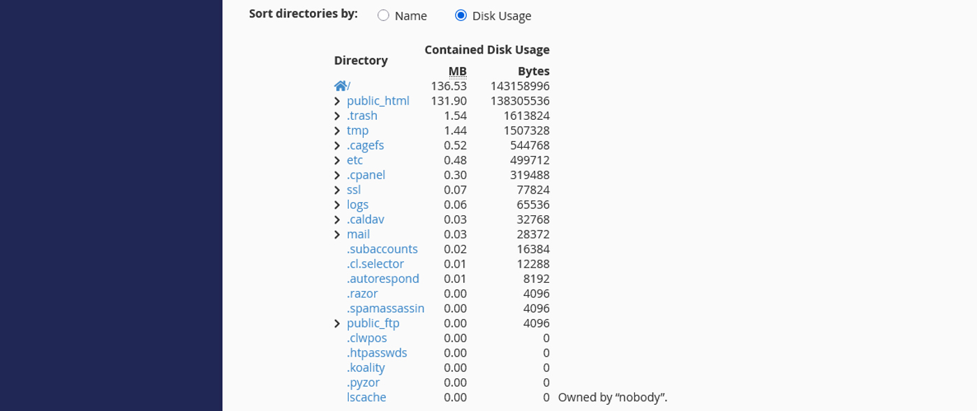 در ادامه این صفحه یک جدول قرار دارد که به شما نشان میدهد کدام بخش از هاست بیشترین فضا را اشغال کرده است. برای نمونه اگر ایمیلها فضای زیادی بگیرند، مصرف در پوشه mail زیاد میشود. یا اگر بکاپهای قدیمی را در هاست نگه داشته باشید، حجم بالایی در پوشه public_html یا tmp ثبت میشود. با بررسی این جدول میتوانید راحتتر تصمیم بگیرید کدام فایلها یا پوشهها را حذف یا منتقل کنید تا فضای هاست خالی شود.