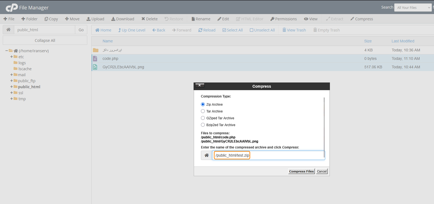 بعد از انتخاب Compress یک پنجره جدید باز میشود. در این بخش باید نوع فایل فشرده را مشخص کنید. گزینه Zip Archive (.zip) رایجترین فرمت بوده و در اکثر سیستمها قابل استفاده است. گزینههای Tar Archive (.tar) یا GZip (.tar.gz) بیشتر برای سرورهای لینوکسی استفاده میشوند. در نهایت مسیر ذخیره فایل فشرده را انتخاب کرده و روی Compress File(s) کلیک کنید.