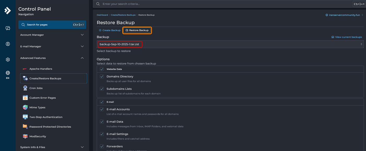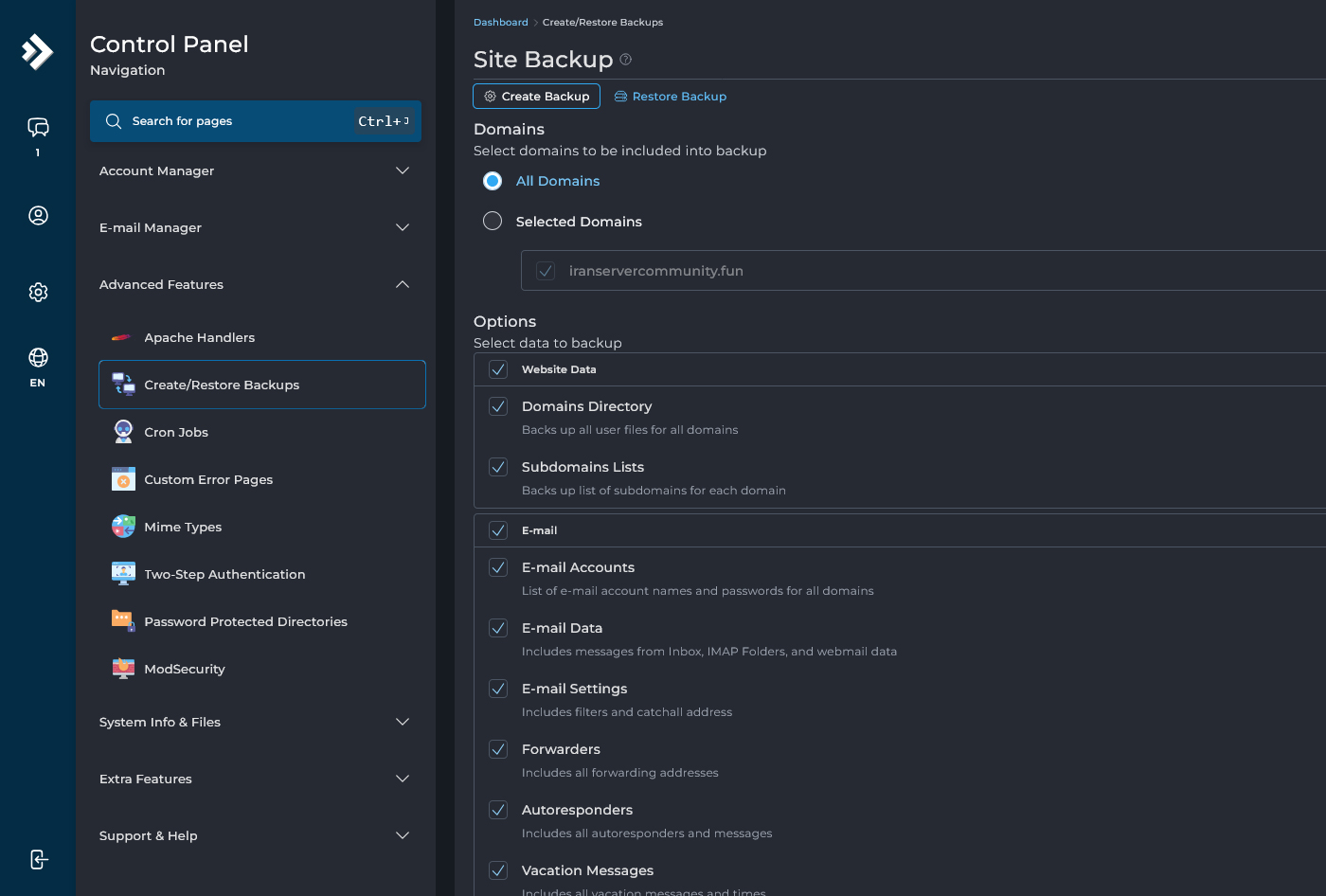 اکنون باید گزینه Create Backup را از بالا انتخاب کنید و سپس دامنه مورد نظر خود را انتخاب کنید. در صفحه بکاپگیری لیستی از قسمتهای مختلف هاست به شما نشان داده میشود. این لیست شامل فایلهای سایت، دیتابیسها، اکانتهای ایمیل، تنظیمات DNS و حتی کرانجابها میباشد. شما میتوانید تصمیم بگیرید فقط یک بخش خاص مثل دیتابیس را بکاپ بگیرید یا اینکه همه گزینهها را انتخاب کنید تا یک نسخه کامل از هاست ذخیره شود. پس از انتخاب، باید روی دکمه Create Backup کلیک کنید تا عملیات شروع شود. انتخاب درست در این مرحله اهمیت دارد، چون اگر فقط بخشی از اطلاعات را ذخیره کنید، در زمان بازگردانی ممکن است بخشهای دیگر را از دست بدهید.