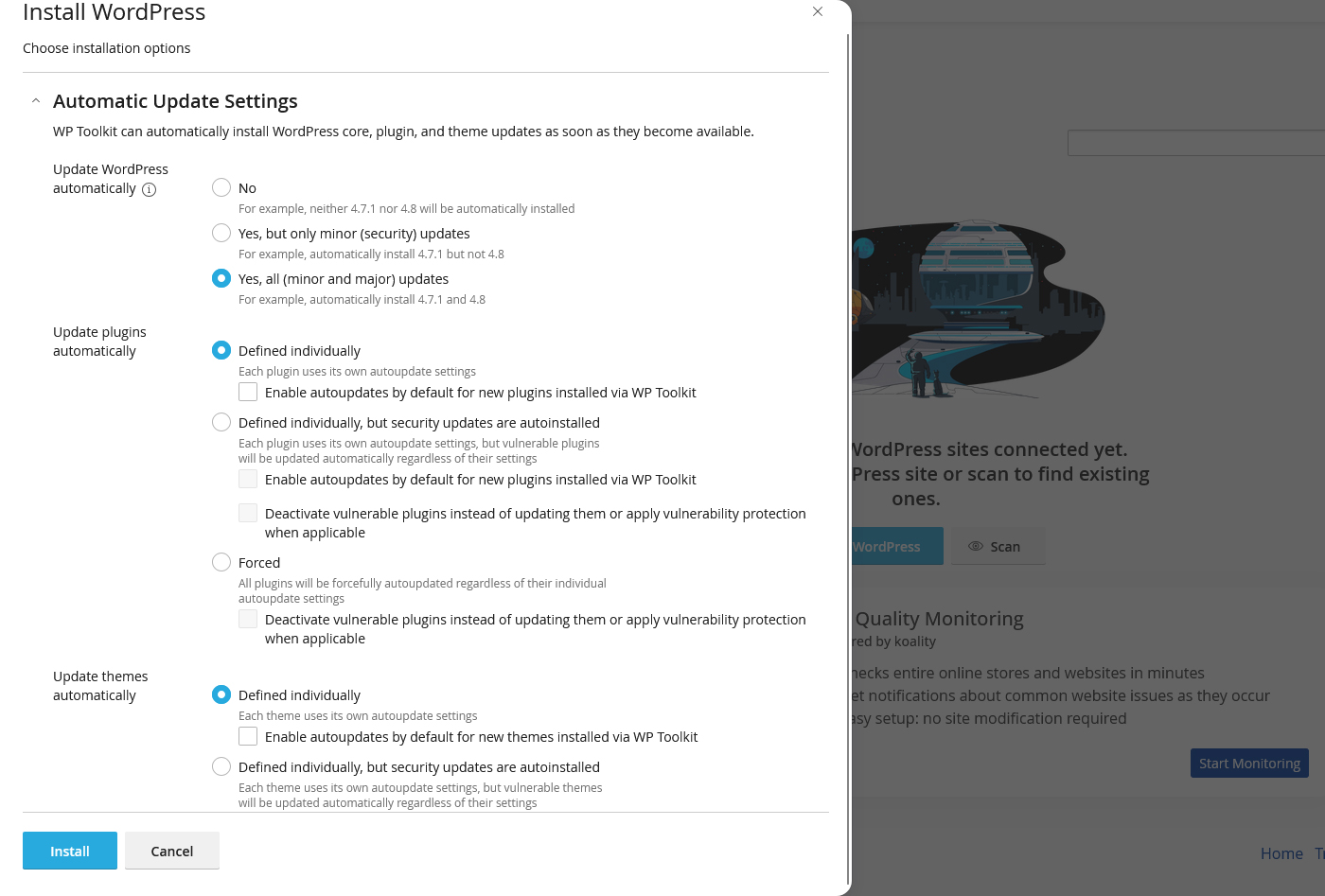در Update plugins automatically حالت پیشفرض «Defined individually» است؛ یعنی برای هر افزونه در خود وردپرس میتوانید تصمیم بگیرید که به صورت خودکار بهروزرسانی شود یا نه. اگر تیک Enable autoupdates by default for new plugins installed via WP Toolkit را فعال کنید، افزونههای جدیدی که از طریق WP Toolkit نصب میکنید بهطور پیشفرض روی بهروزرسانی خودکار قرار میگیرند. گزینه Defined individually, but security updates are autoinstalled باعث میشود حتی اگر یک افزونه روی خودکار نباشد، بهروزرسانیهای امنیتی آن بدون معطلی نصب شوند. همچنین اگر گزینه Deactivate vulnerable plugins را ببینید و فعال کنید، WP Toolkit در صورت شناسایی آسیبپذیری جدی، افزونه مشکلدار را بهجای بهروزرسانی نامطمئن، غیرفعال میکند تا امنیت سایت حفظ شود. برای بیشتر سایتها، ترکیب «بهروزرسانی خودکار امنیتی» و «غیرفعالسازی افزونههای آسیبپذیر» بهترین تعادل بین امنیت و پایداری است.