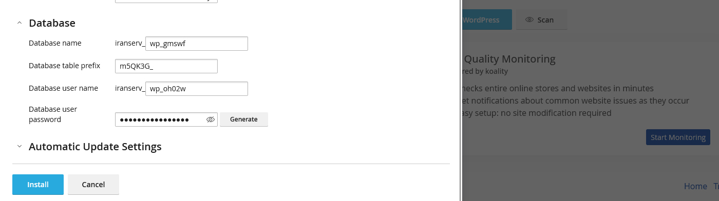 در Database name نام پایگاهداده بهصورت خودکار تولید میشود، اما در صورت نیاز میتوانید آن را تغییر دهید. در Database table prefix پیشوند جداول مشخص است؛ بهتر است از مقدار پیشفرض wp_ استفاده نکنید و همان پیشوند تصادفی که WP Toolkit پیشنهاد میدهد را نگه دارید تا اسکنهای خودکار سختتر شود. در Database user name یک کاربر اختصاصی برای این دیتابیس ساخته میشود و در Database user password هم رمز قوی تنظیم کنید یا از Generate برای ساخت رمز امن کمک بگیرید. نام دیتابیس، کاربر و رمز را یادداشت کنید تا در صورت نیازهای بعدی (مثل انتقال یا اشکالزدایی) در دسترس باشد. توجه کنید تغییر پیشوند جداول پس از نصب، کار سادهای نیست؛ بنابراین همین حالا آن را درست انتخاب کنید.