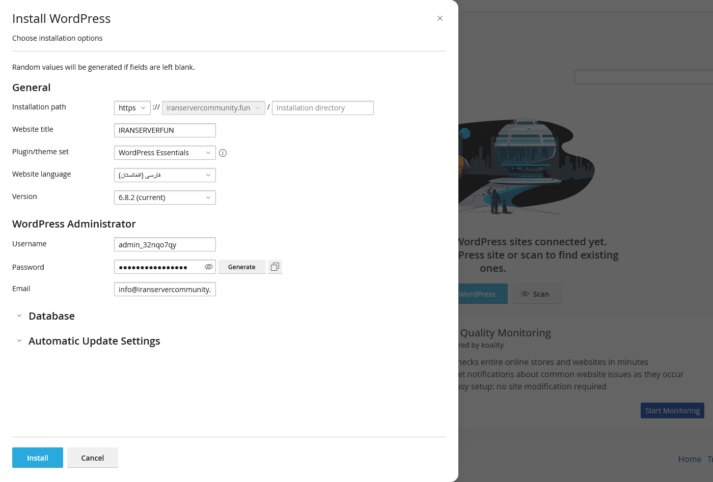 بعد از فشردن دکمه Install WordPress فرم نصب باز شود. این فرم چند بخش دارد: General، WordPress Administrator، Database و Automatic Update Settings. هر کادر را به دقت پر کنید تا نصب بدون خطا انجام شود.