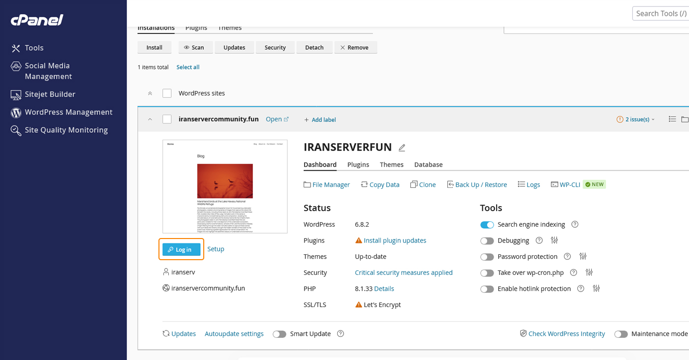 پس از اتمام نصب، سایت شما در صفحه اصلی WP Toolkit بهصورت یک کارت دیده میشود. با دکمه Log in بدون نیاز به وارد کردن نام کاربری و رمز، مستقیم وارد پیشخوان وردپرس میشوید.