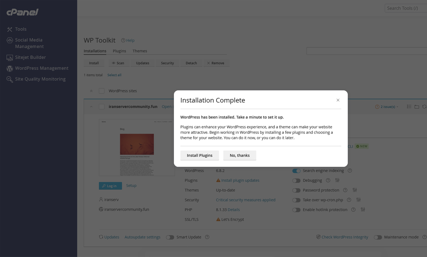 پس از بررسی همه فیلدها روی دکمه Install کلیک کنید. WP Toolkit مسیر نصب را میسازد، فایلهای وردپرس را مستقر میکند، پایگاهداده و کاربر آن را ایجاد کرده و فایل پیکربندی را تنظیم میکند. اگر دایرکتوریای که انتخاب کردهاید از قبل حاوی فایل باشد، ممکن است خطا دریافت کنید؛ در این صورت مسیر را خالی کنید. اگر https انتخاب کردهاید ولی SSL فعال نیست، ابتدا از بخش «SSL/TLS» یا «Let’s Encrypt» در پنل کاربری ایرانسرور، گواهی رایگان را صادر و نصب کنید و سپس دوباره نصب را انجام دهید.
