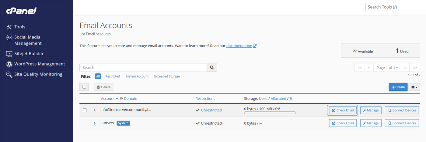 پس از ورود به بخش Email Accounts، لیستی از تمام ایمیلهایی که روی دامنه ساختهاید نمایش داده میشود. روبهروی ایمیل مورد نظر خود، روی دکمه Check Email کلیک کنید.
