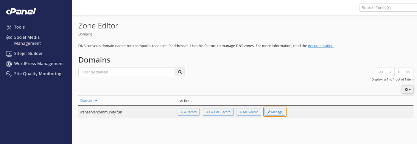 اگر روی هاست شما چند دامنه متصل باشد، لیست آنها در این بخش نمایش داده میشود. جلوی هر دامنه دکمهای با نام Manage وجود دارد. باید روی Manage دامنهای که میخواهید رکوردهای آن را تغییر دهید کلیک کنید تا رکوردهای مربوط به همان دامنه نمایش داده شود.