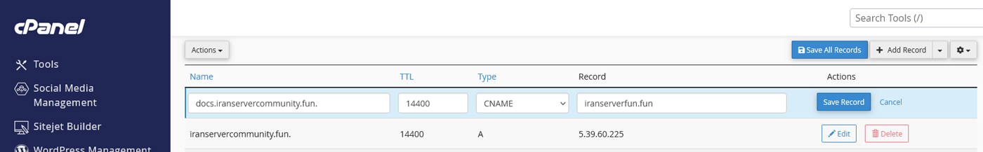docs) را وارد کنید. - در قسمت CNAME نام دامنه اصلی را بنویسید (مثلاً