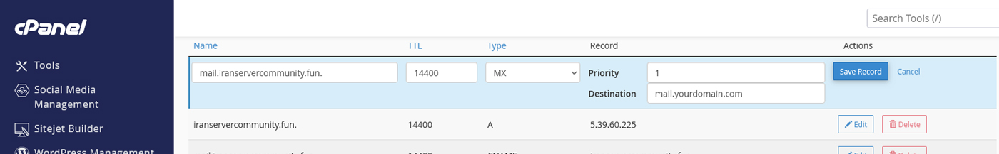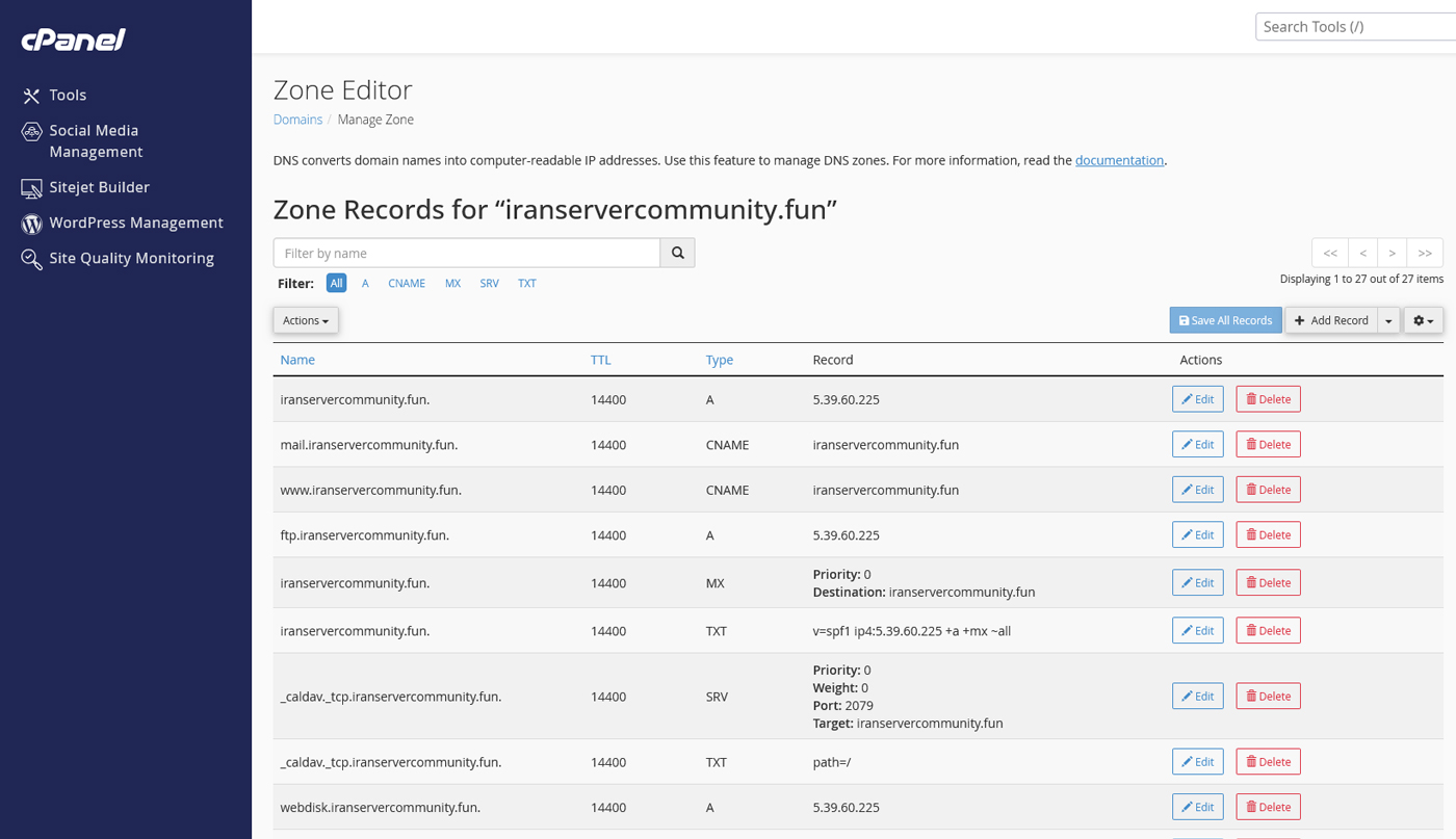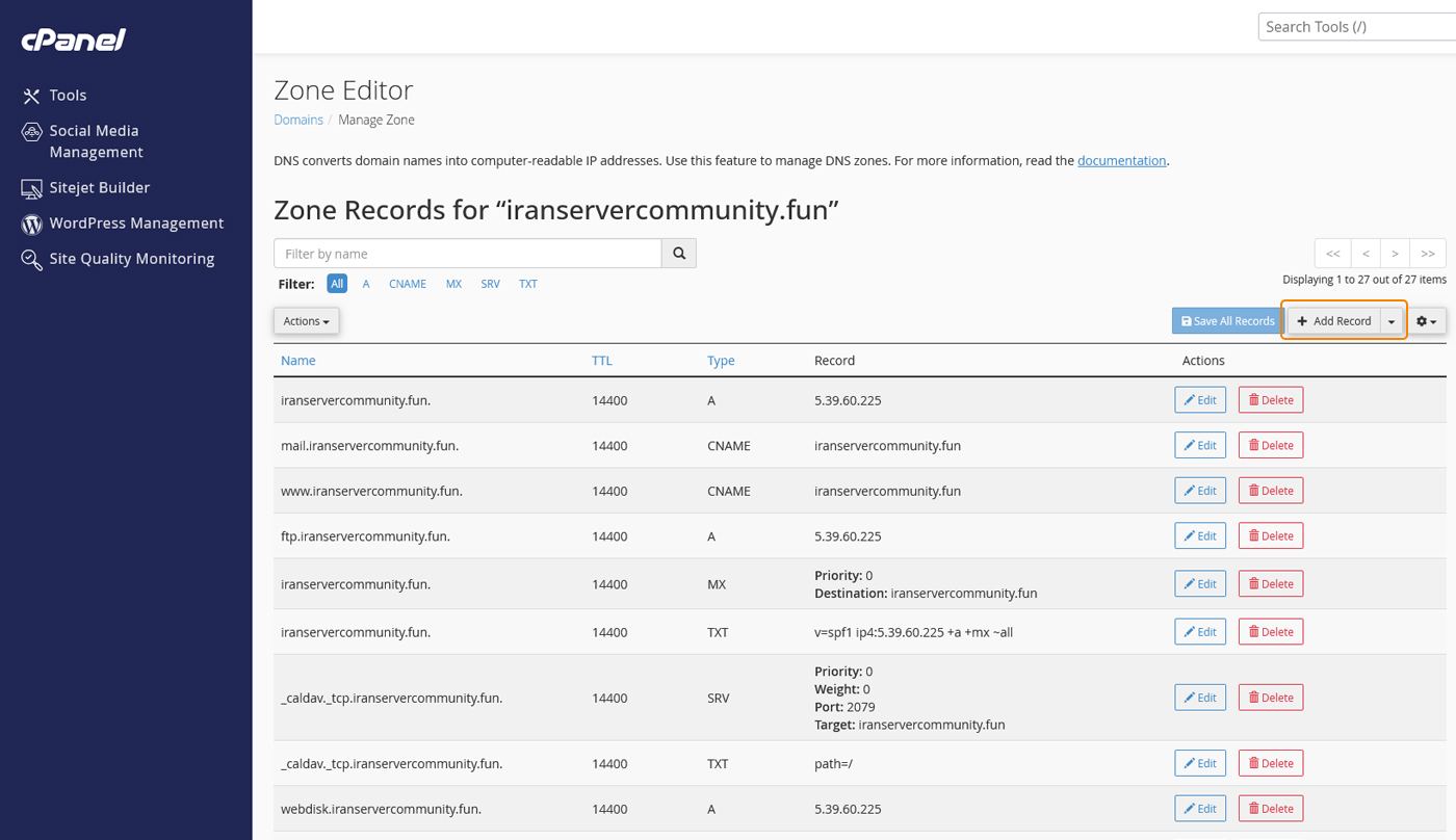 گاهی نیاز دارید رکوردها را تغییر دهید یا رکوردی که اشتباه وارد شده را پاک کنید. در لیست رکوردها، کنار هرکدام گزینههای Edit (برای ویرایش) و Delete (برای حذف) وجود دارد. همیشه قبل از تغییر رکوردها دقت کنید، چون تنظیمات اشتباه باعث میشود سایت یا ایمیلها از کار بیفتند.