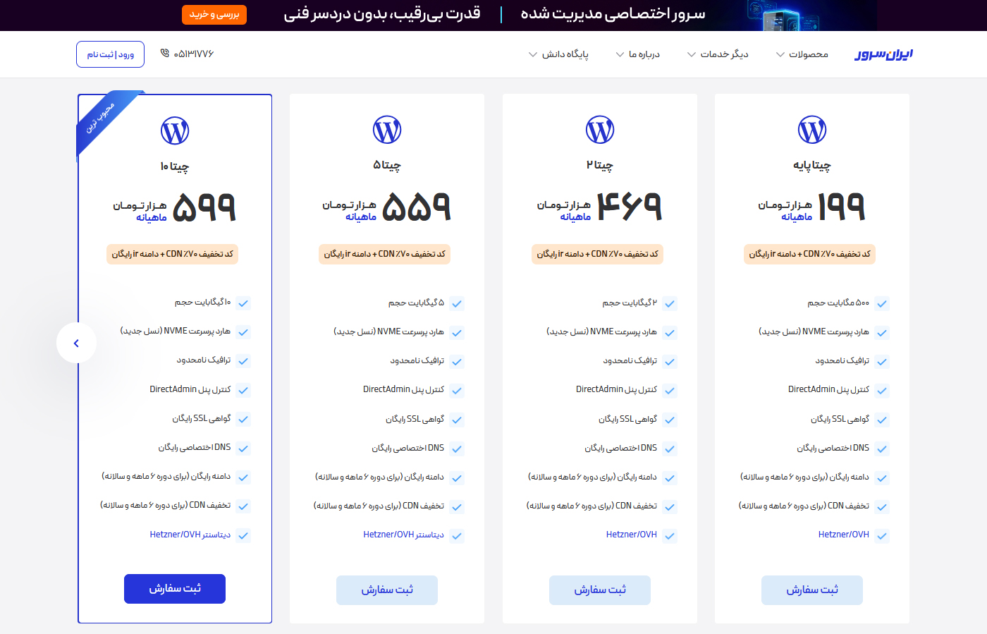 پس از انتخاب نوع پنل، لیست پلنهای هاست زیر آن نمایش داده میشود. در این مرحله پلنهای مختلف با ویژگیهای متفاوت نمایش داده میشوند. با کشیدن جدول به چپ و راست میتوانید همه پلنها را مشاهده کنید. سپس یکی از پلنها را انتخاب کرده و روی گزینه ثبت سفارش کلیک کنید.