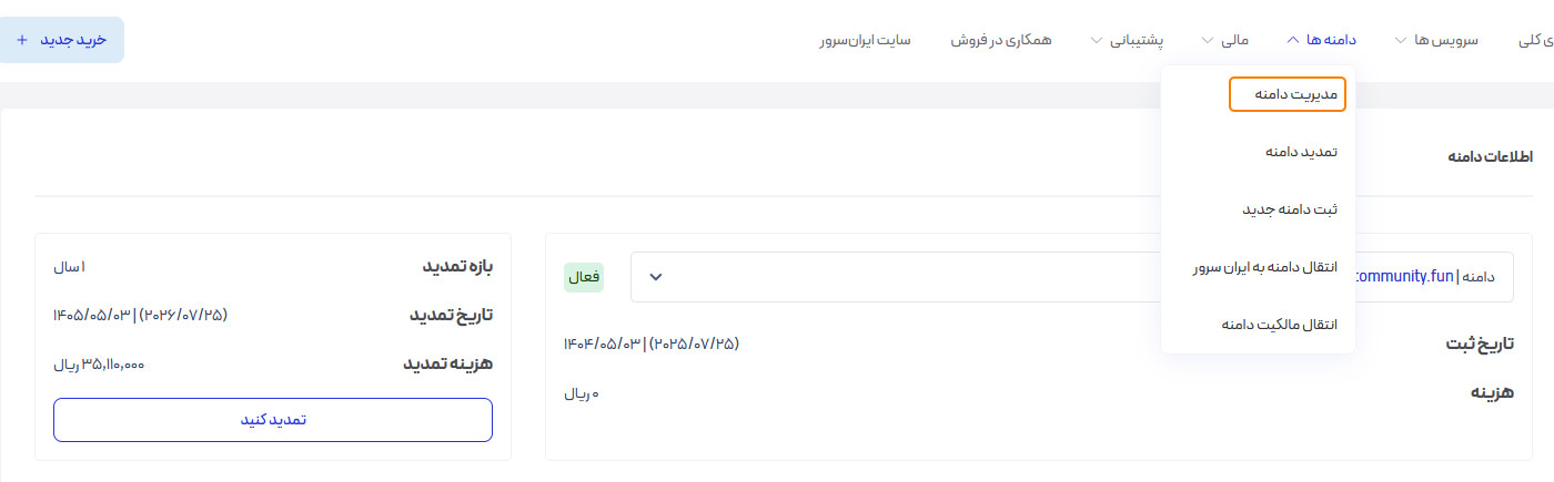 پس از ورود به پنل، در منوی بالای صفحه گزینهای به نام «دامنهها» را مشاهده میکنید که با نگه داشتن ماوس روی آن میتوانید وارد قسمت مدیریت دامنه شوید.