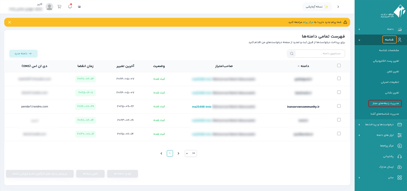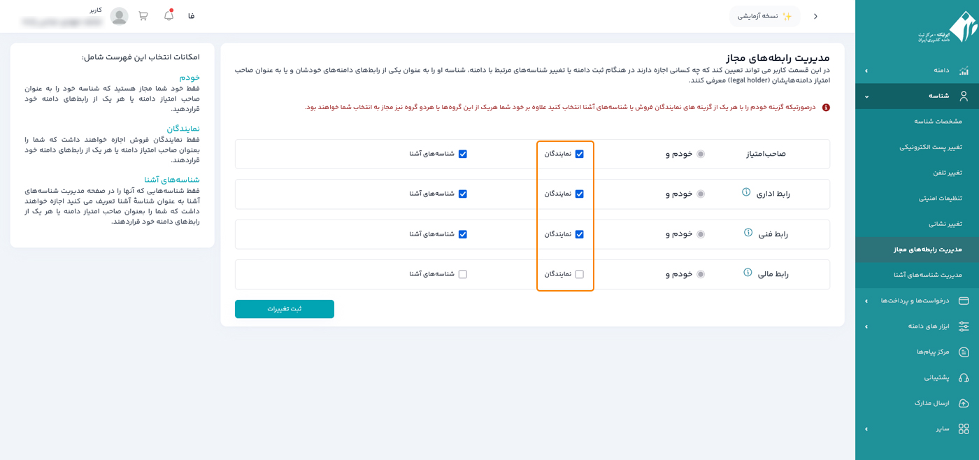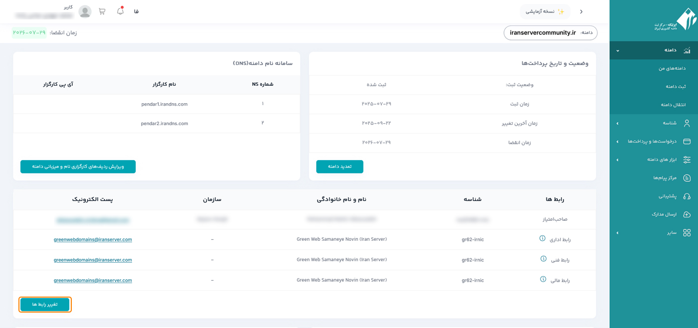 با تنظیم درست رابط‌های مجاز در ایرنیک، کنترل کامل و امنی بر دامنه‌های خود خواهید داشت. پیشنهاد می‌شود برای سهولت در تمدید و پشتیبانی، گزینه نمایندگان را برای رابط‌های مالی و فنی فعال نگه دارید.