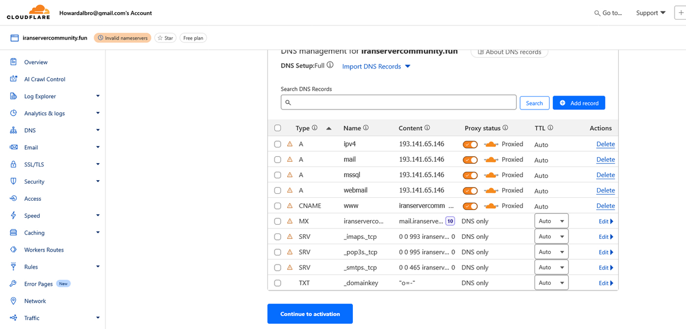 پس از اسکن، کلادفلیر فهرستی از رکوردهای DNS دامنه شما را نمایش می‌دهد. این رکوردها شامل آدرس‌های آی‌پی (A record)، رکوردهای ایمیل (MX) و رکوردهای CNAME هستند. در این بخش باید با دقت بررسی کنید که تمام رکوردها درست و کامل باشند. اگر رکوردی ناقص بود، مثلاً رکورد مربوط به ایمیل یا وب‌سایت، آن را به‌صورت دستی اضافه کنید. برای کاربرانی که از سرویس ایمیل استفاده می‌کنند، بررسی دقیق رکوردهای MX بسیار ضروری است. در صورت نیاز می‌توانید از گزینه Add Record استفاده کنید و رکورد جدید اضافه نمایید. این مرحله اهمیت زیادی دارد زیرا اگر رکوردها به درستی وارد نشوند، ممکن است وب‌سایت یا ایمیل شما با اختلال مواجه شود.
