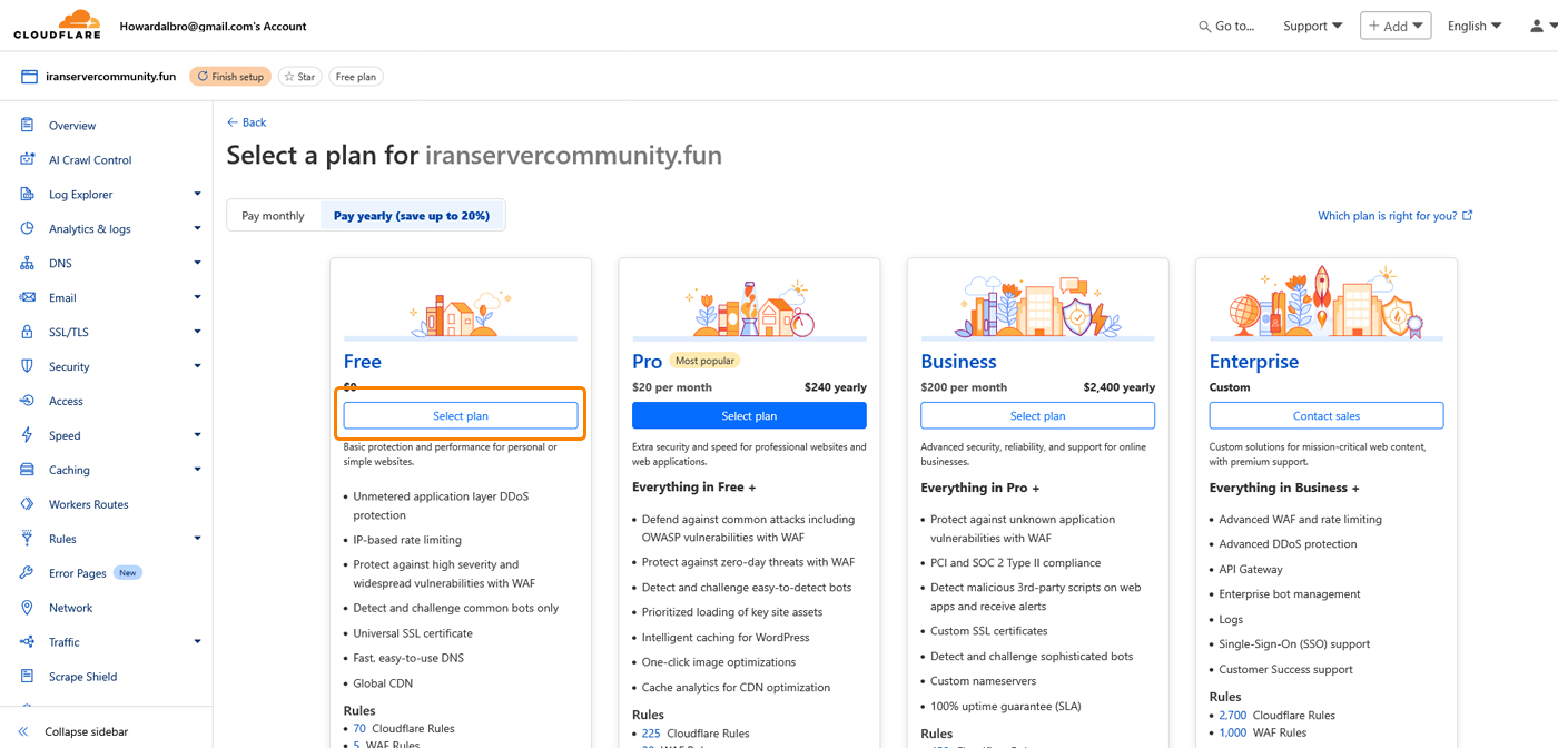 در مرحله بعد کلادفلیر از شما می‌خواهد که نوع پلن را انتخاب کنید. پیشنهاد می‌شود برای شروع پلن رایگان (Free) را انتخاب کنید و به مرحله بعد بروید.