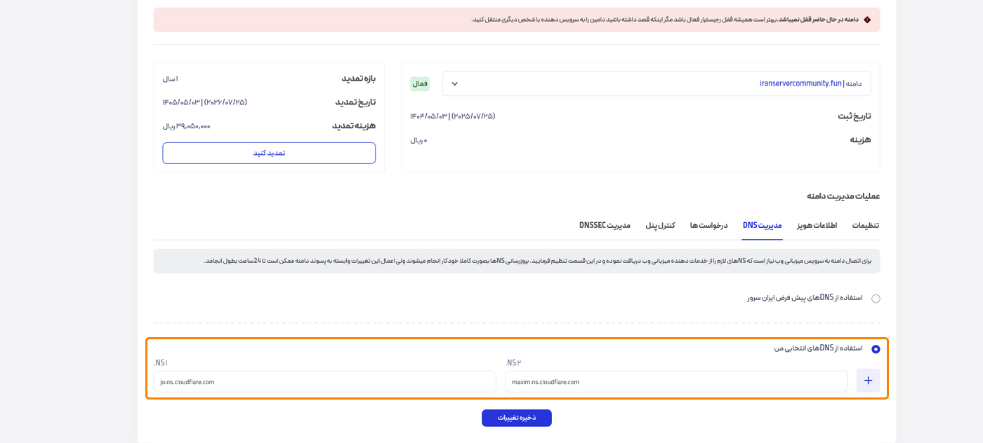 در این بخش، کادرهایی برای وارد کردن رکوردهای DNS یا همان Name Server وجود دارد. شما می‌توانید اطلاعات کلادفلیر را در قسمت نارنجی رنگ وارد کنید و در پایان دکمه «ذخیره تغییرات» را بزنید تا DNS دامنه به‌روزرسانی شود.