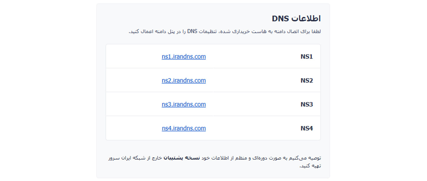 هر دامنه برای اتصال به اینترنت باید از نیم‌سرورها (nameservers) استفاده کند. وقتی هاست خریداری می‌کنید، نیم‌سرورهای پیش‌فرض ایران‌سرور برای شما فعال هستند. برای مشاهده این نیم‌سرورها باید از دو روش زیر استفاده کنید.