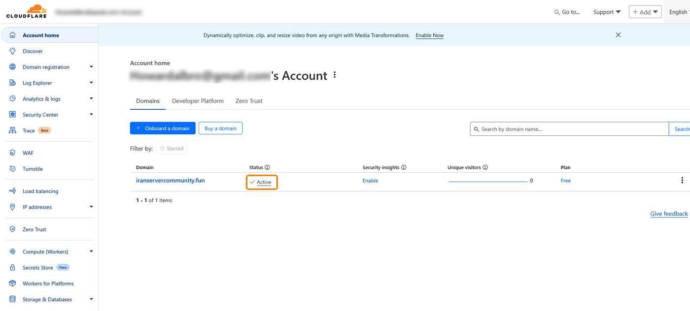 بعد از گذشت چند ساعت از تغییر نیم‌سرورها، باید وارد حساب کلادفلیر خود شوید. اگر تغییر نیم‌سرورها به درستی انجام شده باشد، وضعیت دامنه به حالت Active تغییر خواهد کرد. در این وضعیت دامنه شما به‌طور کامل از طریق کلادفلیر فعال است. برای اطمینان می‌توانید سایت خود را در مرورگر باز کنید و بررسی کنید که سایت بدون مشکل بارگذاری می‌شود.
