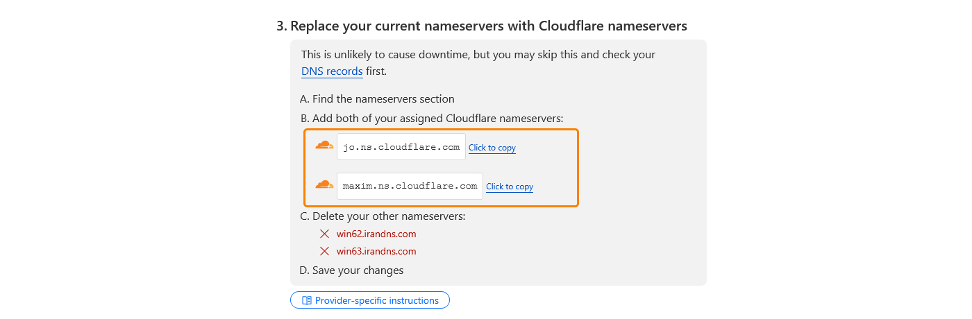 در پایان این مراحل، کلادفلیر دو نیم‌سرور اختصاصی برای دامنه شما معرفی می‌کند. اکنون باید این نیم‌سرورها را جایگزین نیم‌سرورهای فعلی دامنه خود در پنل ایران‌سرور کنید.