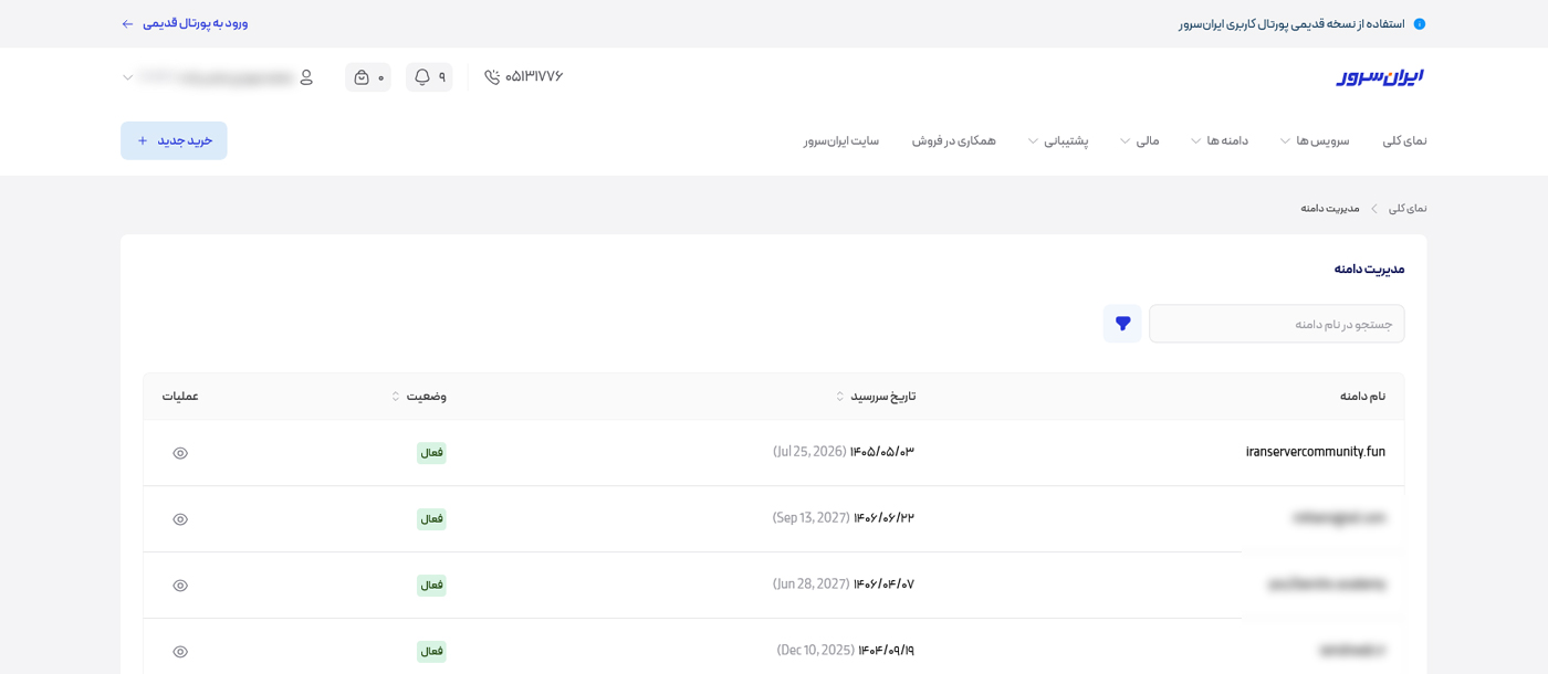 برای دریافت کد EPP ابتدا باید وارد پنل کاربری ایرانسرور شوید. پس از ورود، از منوی بالا به بخش دامنهها بروید و دامنه مورد نظر خود را انتخاب کنید. با کلیک روی نام دامنه، وارد صفحه مدیریت همان دامنه خواهید شد.
