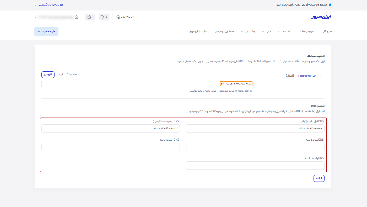 در این مرحله میتوانید ابتدا کد انتقال دامنه را مجدد در کادر نارنجی رنگ چک کنید. در ادامه نیمسرورهای فعلی دامنه نمایش داده میشوند. اگر دامنه به هاستی متصل نیست یا نیمسروری نمایش داده نمیشود، میتوانید از نیمسرورهای پیشفرض ایرانسرور استفاده کنید. اگر نیم سرورهای هاست را دارید در کادر قرمز رنگ وارد کنید. سپس روی دکمه “ادامه” کلیک کنید.