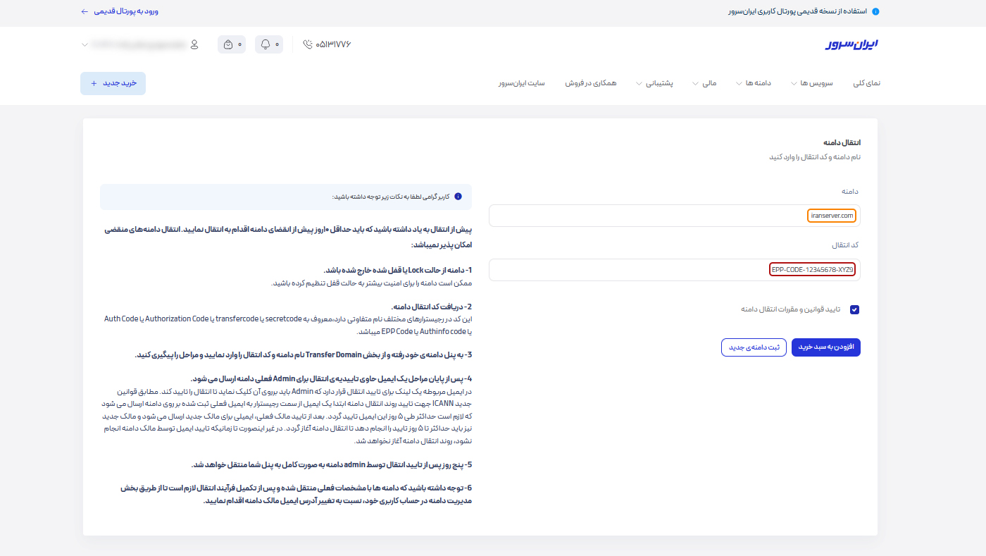 - دریافت کد انتقال (EPP یا Auth code) الزامی است. این کد معمولاً در پنل دامنه قبلی قابل مشاهده یا درخواست است.