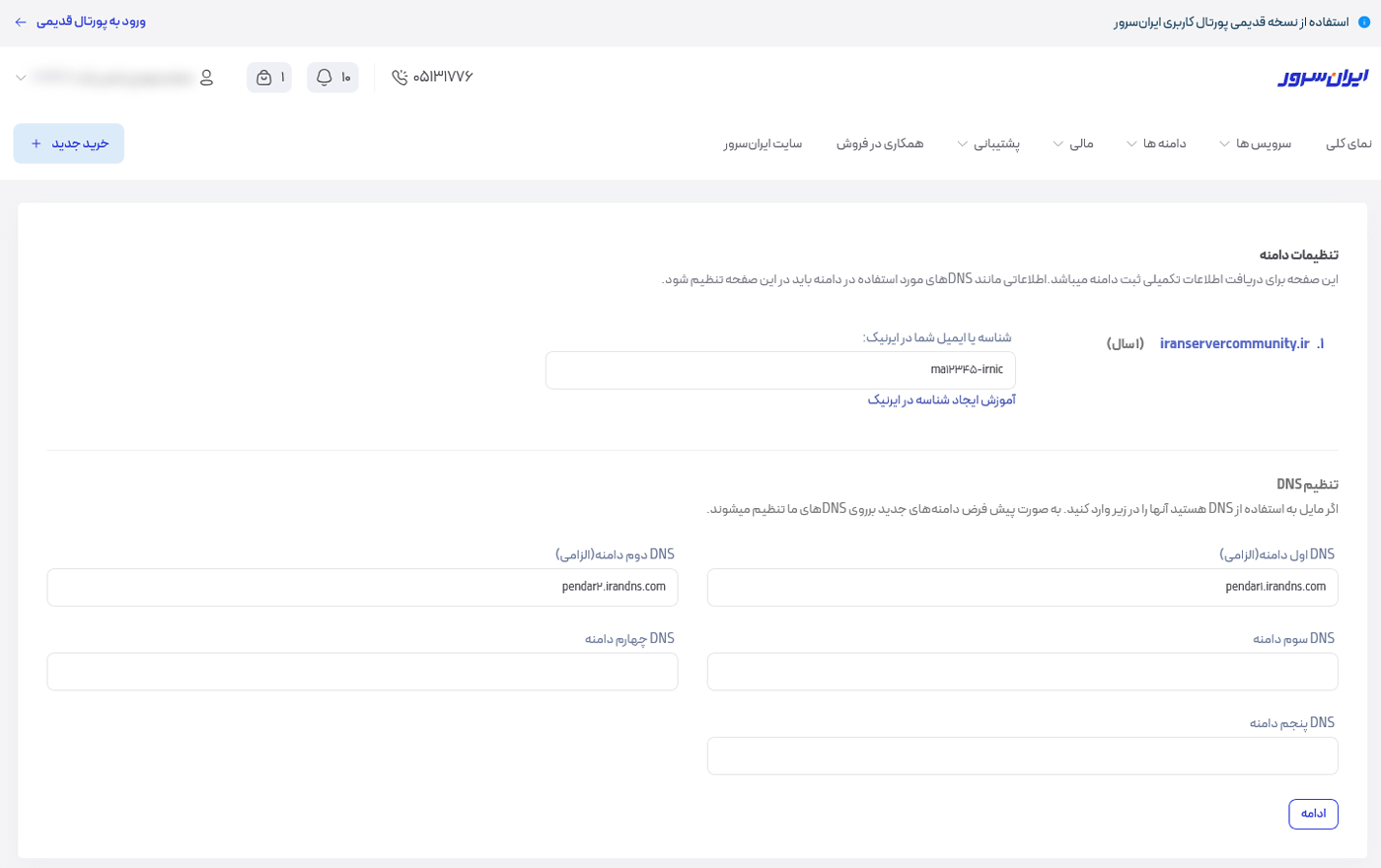 در این مرحله ابتدا باید شناسه ایرنیک خود را وارد کنید. در ادامه DNS های متصل به دامنه شما نمایش داده میشوند؛ اگر قصد دارید دامنه را به هاست ایرانسرور متصل کنید، میتوانید نیمسرورهای پیشفرض ایرانسرور را انتخاب کنید. در صورتی که نیمسرورهای دیگری دارید، کافیست اطلاعات آنها را وارد کنید و روی ادامه کلیک نمایید.