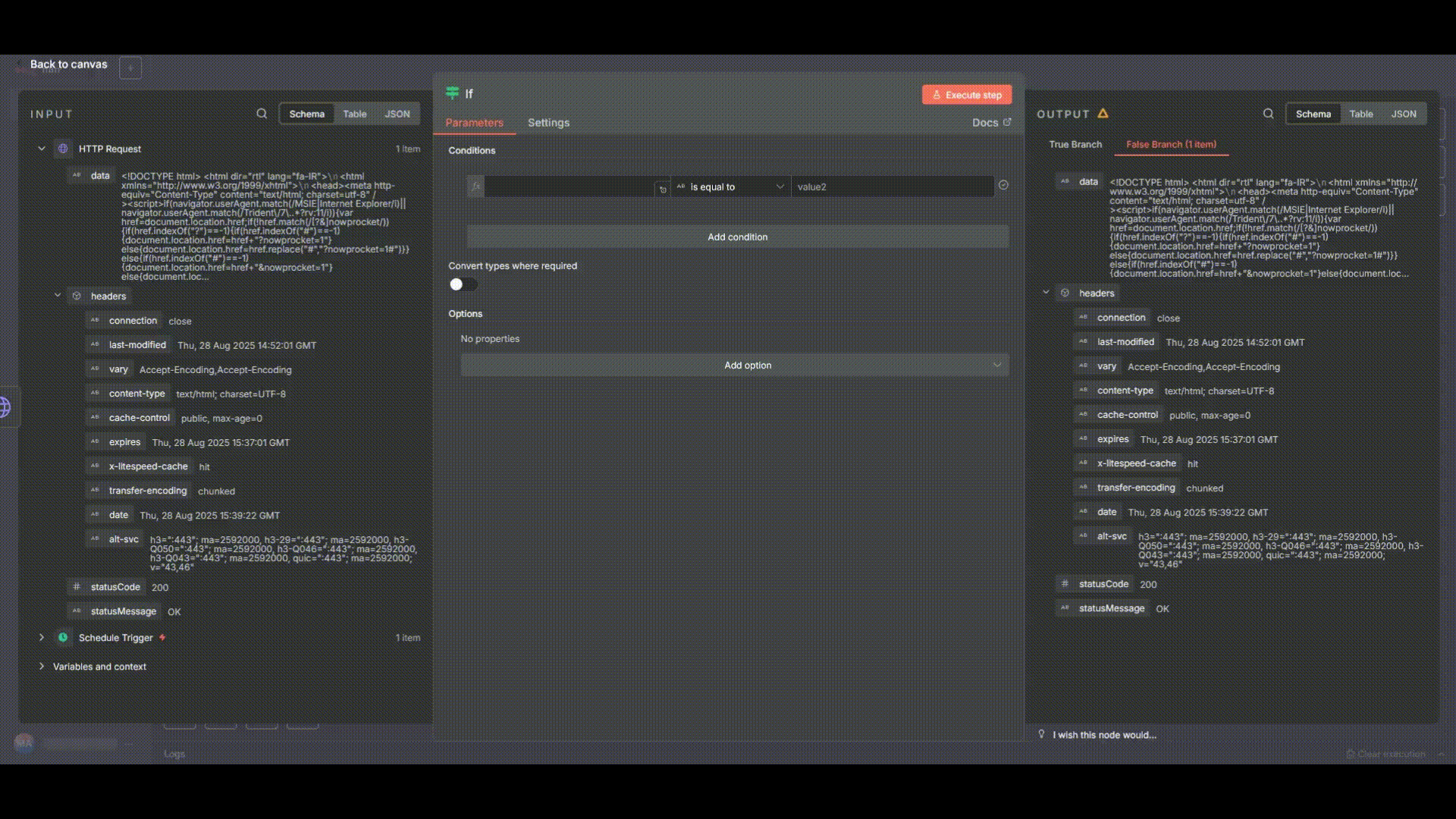 در این مرحله باید مشخص کنیم چه زمانی هشدار داده شود. برای این کار یک نود If اضافه کنید و آن را به خروجی HTTP Request وصل کنید. در تنظیمات If تعیین کنید که اگر statusCode برابر با 200 نبود (یعنی سایت خطا داشت یا در دسترس نبود) مسیر «True» فعال شود که نشاندهنده مشکل سایت است. در غیر این صورت مسیر «False» فعال میشود که یعنی سایت بدون مشکل کار میکند.